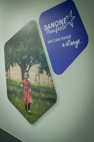 Factory walkways can be dull and boring but the team at Danone wanted make use of these usually over looked spaces into somewhere colourful and motivating for their team. Using the space to tell their stories and plan for the future.
